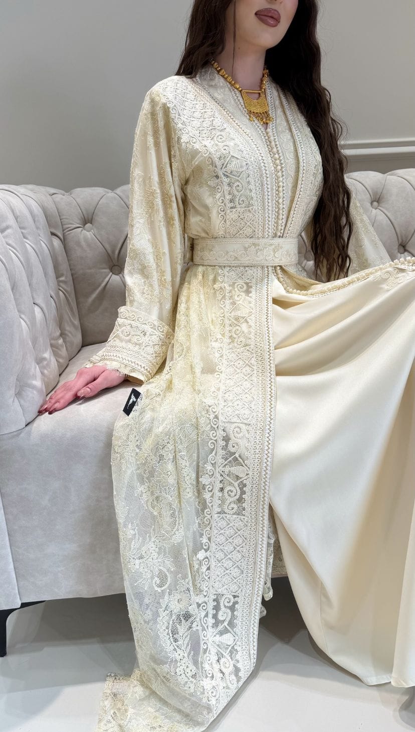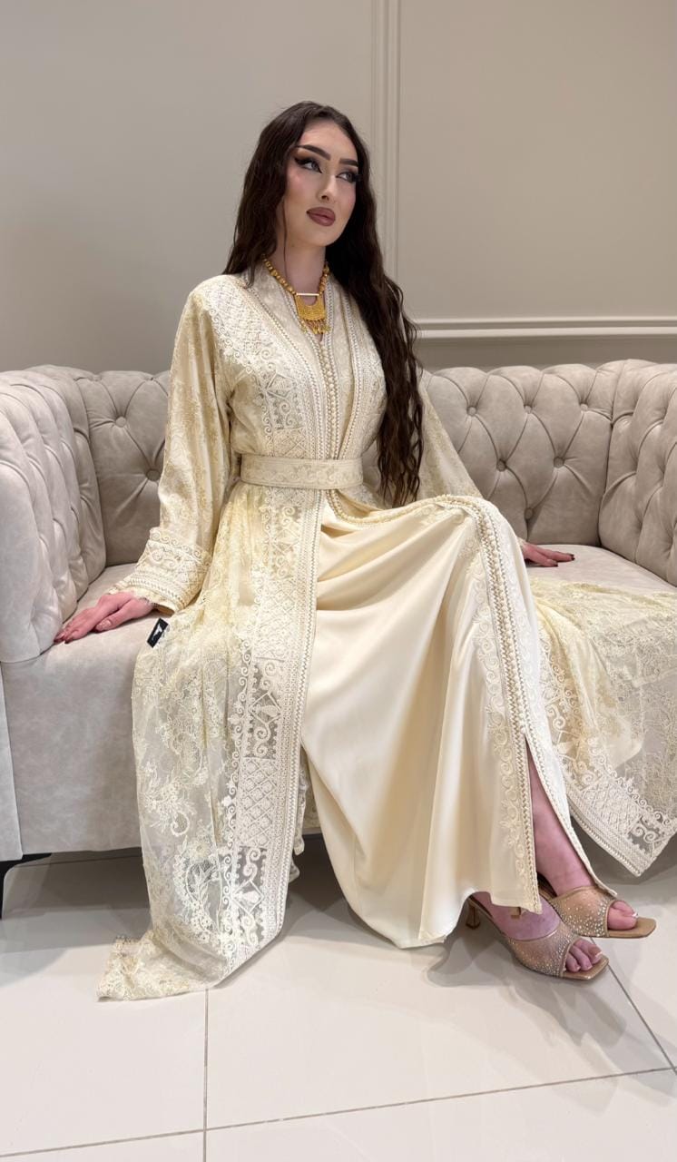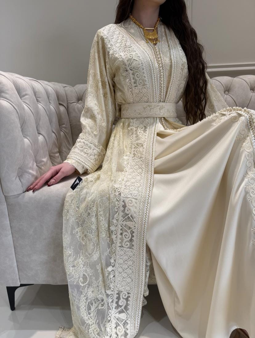 مغربي بالدانتيل الفرنسي الفاخر والتطريز اليدوي مع الحزام